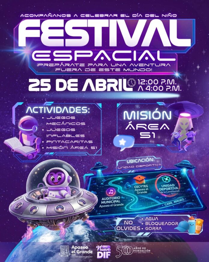 Apaseo el Grande, Gto., a 20 de abril de 2026.- En el marco de la celebración del Día del Niño, el Sistema Municipal DIF de Apaseo el Grande prepara el “Festival Espacial”, un evento gratuito dirigido a niñas y niños del municipio, que se celebrará el próximo sábado 25 de abril en la Unidad Deportiva Centenario de la Constitución de 1917.