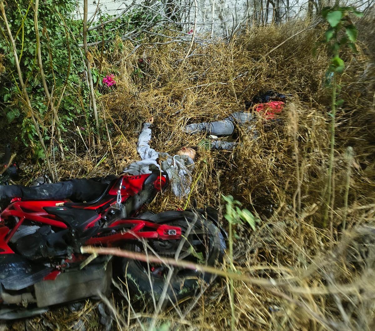 En el lugar fue localizada la motocicleta de color rojo, con visibles daños, así como los cuerpos entre la maleza cercana a la vialidad.