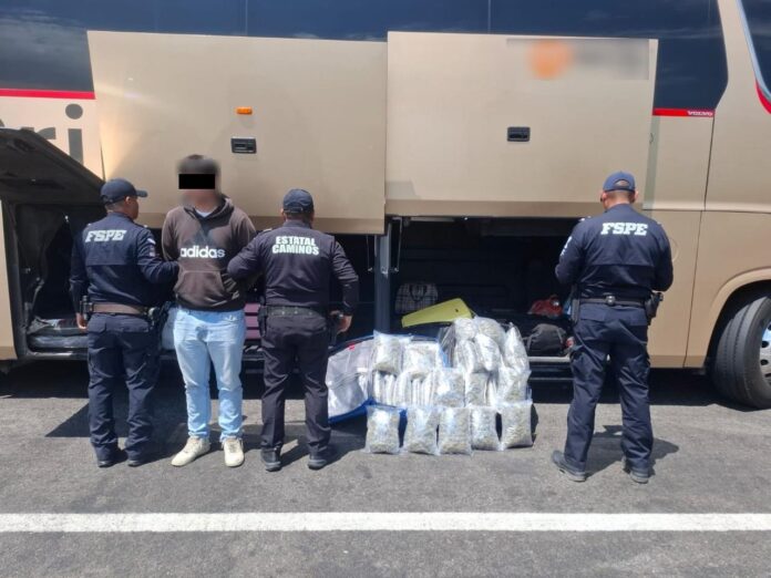 GUANAJUATO, GTO.- Más de 23 mil dosis de una sustancia con características de la marihuana fueron aseguradas por integrantes de la Policía Estatal de Caminos durante la inspección a un autobús de pasajeros en la carretera federal Morelia–Valtierrilla, acción que derivó en la detención de un hombre.