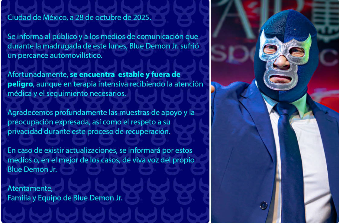 “Blue Demon Jr. está siendo atendido por un equipo médico especializado. Su estado es estable, pero permanecerá bajo observación en terapia intensiva por precaución”, señaló un comunicado compartido por su entorno más cercano.