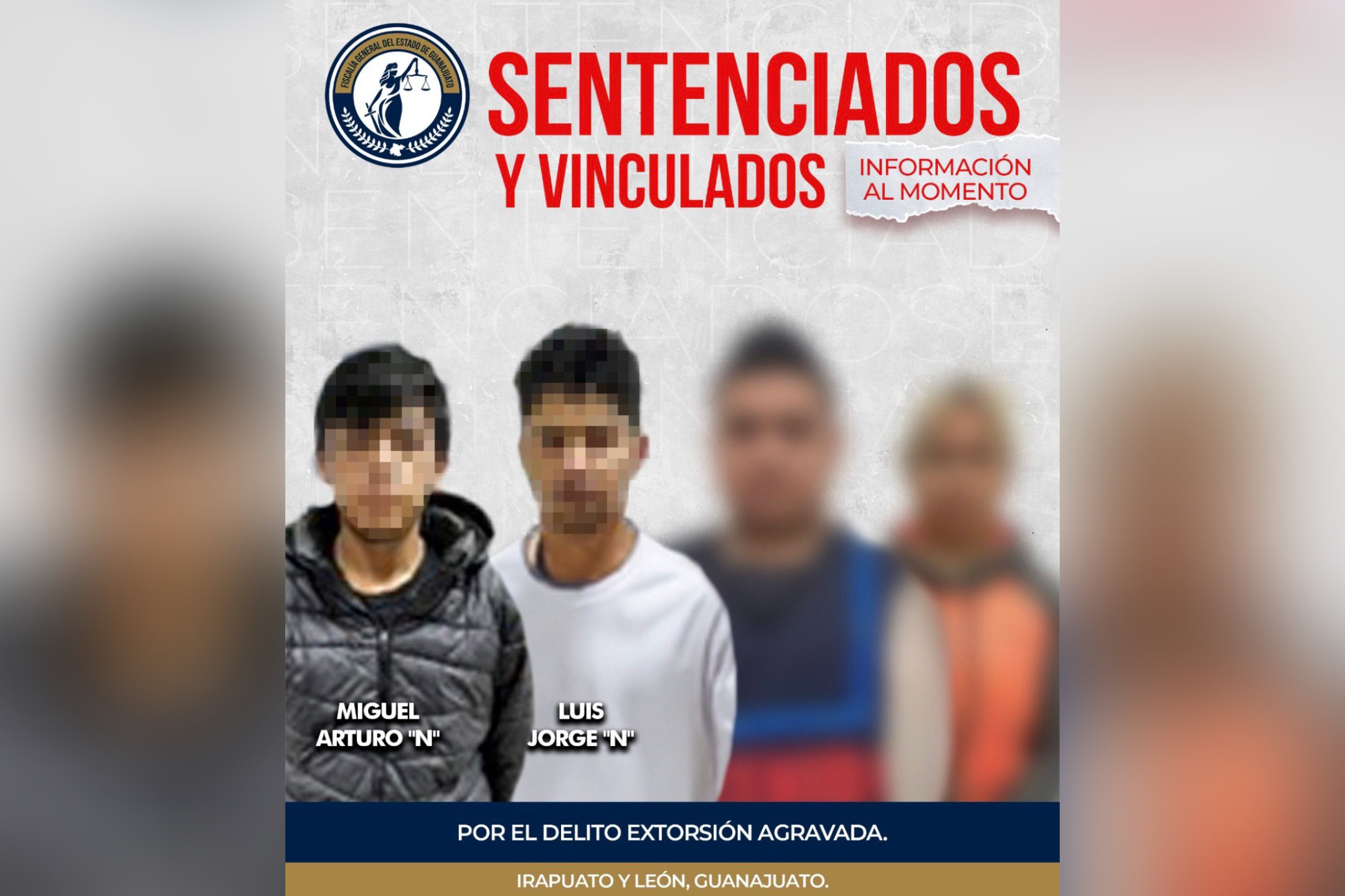 En Irapuato, Miguel Arturo y Luis Jorge fueron sentenciados por extorsión agravada, luego de que en octubre de 2025 intimidaran a un comerciante mediante un mensaje extorsivo entregado en su negocio, ubicado sobre el bulevar Solidaridad, para posteriormente huir del lugar a bordo de una motocicleta.