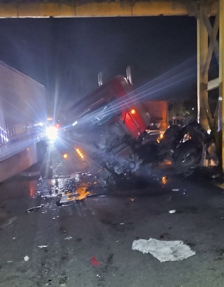 De acuerdo con los primeros reportes, en el choque estuvieron involucrados un camión de carga con cabina roja, otro con cabina negra y un vehículo compacto.