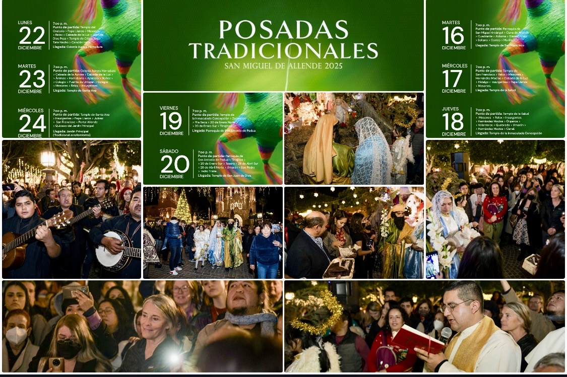 Estas celebraciones se desarrollarán desde este martes y a lo largo de nueve días, recorriendo barrios, templos y calles emblemáticas de la ciudad, fortaleciendo la convivencia familiar y la participación comunitaria. Las posadas comienzan a las 7:00 p. m. Durante cada jornada se realiza la tradicional petición de posada, se entonan villancicos y se entregan aguinaldos a niñas y niños, en un ambiente familiar, seguro y organizado, que honra el peregrinar de San José y la Virgen María en busca de refugio, manteniendo viva una tradición antiquísima que distingue a San Miguel de Allende como un pueblo que celebra su historia, su fe y su comunidad.
