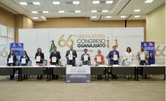 Guanajuato, Gto. – Con el objetivo de establecer un marco de colaboración para desarrollar acciones conjuntas de carácter educativo,  cultural y formativo de las juventudes de la entidad, el Congreso del Estado de Guanajuato y el Colegio de Estudios Científicos y Tecnológicos del Estado (CECyTE) Guanajuato llevaron a cabo una firma de convenio de colaboración.