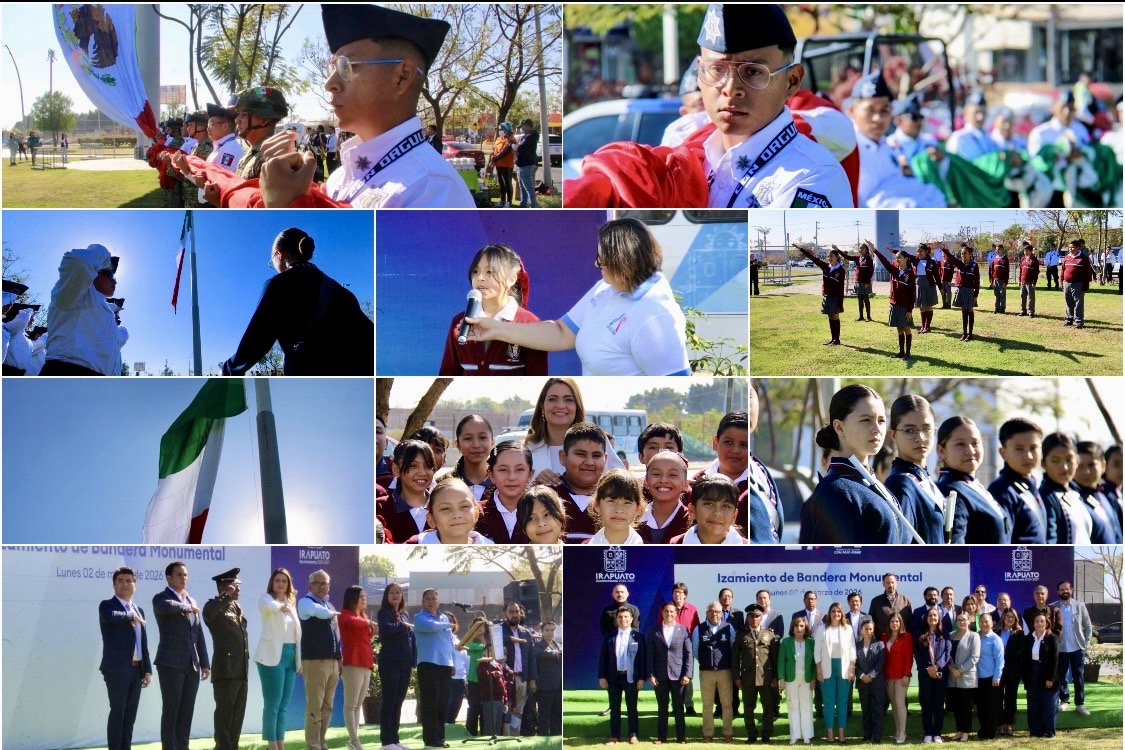 Irapuato, Gto.– Autoridades del Gobierno de Irapuato llevaron a cabo el izamiento de la bandera monumental en la glorieta del bulevar Solidaridad, con el objetivo de dar inicio al mes de marzo y conmemorar sus efemérides más importantes, promoviendo los valores cívicos, el respeto a los símbolos patrios, así como el amor por México y por Irapuato.