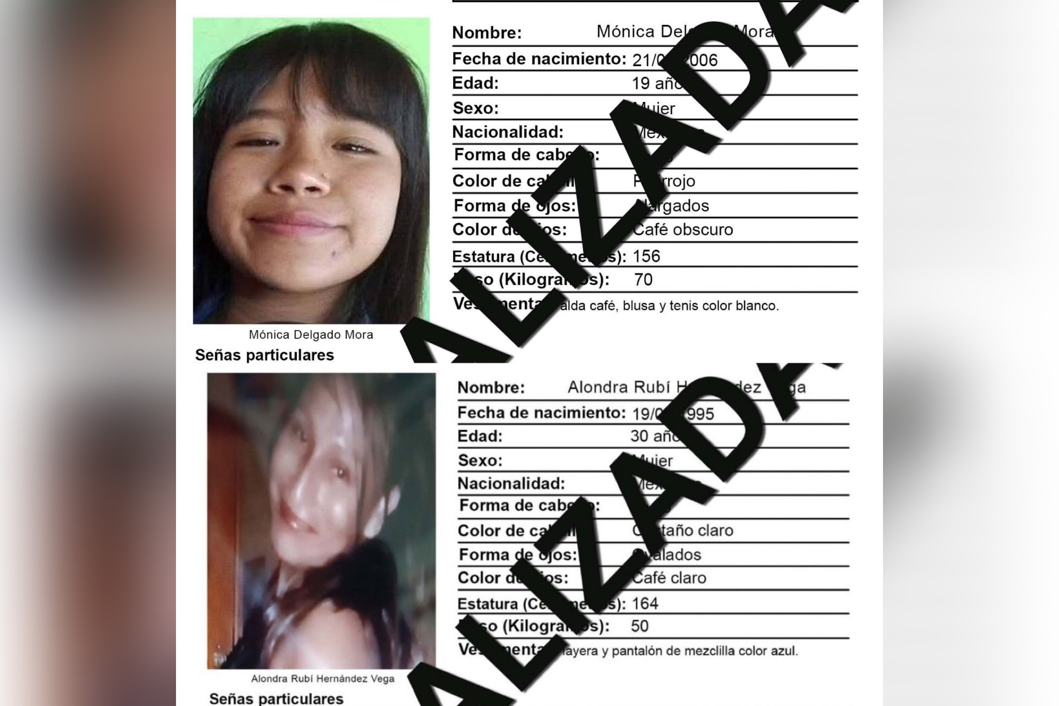 Se trata de Mónica Delgado Mora, de 19 años de edad, quien fue reportada como desaparecida el 26 de febrero de 2025, y de Alondra Rubí Hernández Vega, de 30 años, cuyo reporte de desaparición se emitió el 12 de mayo de 2025, ambas en el municipio de Celaya.