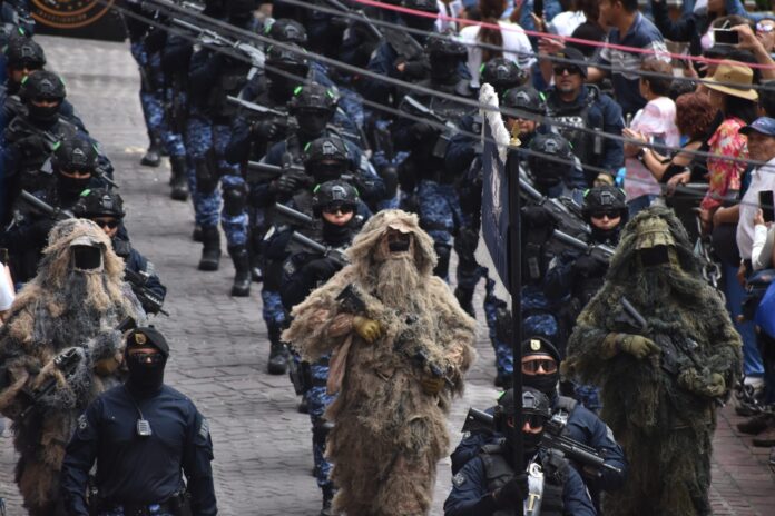 Resuena varias veces la arenga: “Sacrificio y Lealtad”, las fuerzas de seguridad avanzan entre confeti y aplausos, aunque la mayoría del tiempo lo hacen entre comunidades, caminos, y colonias trabajando por la tranquilidad de los guanajuatenses.