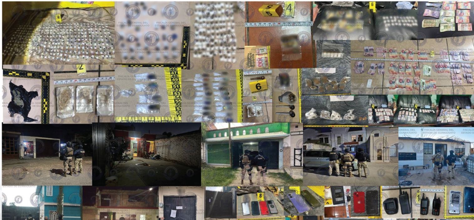 Durante los cateos se aseguraron 16 vehículos, ocho armas de fuego, más de 18 mil dosis de distintas drogas listas para su venta, cartuchos, básculas, dinero en efectivo y equipos de comunicación.