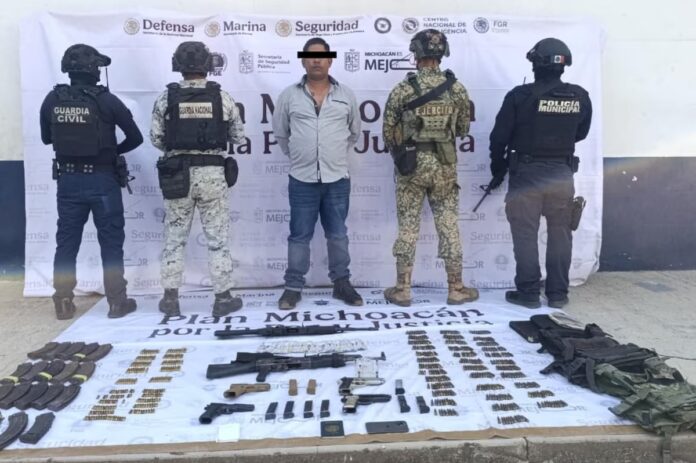 Personal desplegado en La Estanzuela, de Tepalcatepec, detuvo al sospechoso de 35 años, quien fue sorprendido portando dos fusiles semiautomáticos, cuatro armas cortas calibre 9 milímetros y 25 cargadores.