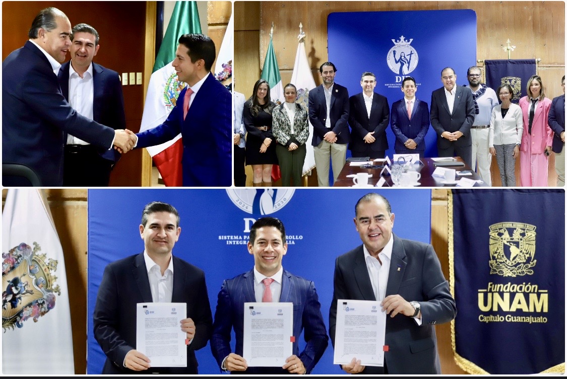 El convenio fue firmado por el presidente del Consejo Consultivo del Sistema DIF Estatal, Juan Carlos Montesinos Carranza, el Director General, José Alfonso Borja Pimentel y el presidente de la Fundación UNAM Capítulo Guanajuato, Javier Aguirre Vizzuett, en presencia de consejeros y representantes académicos.