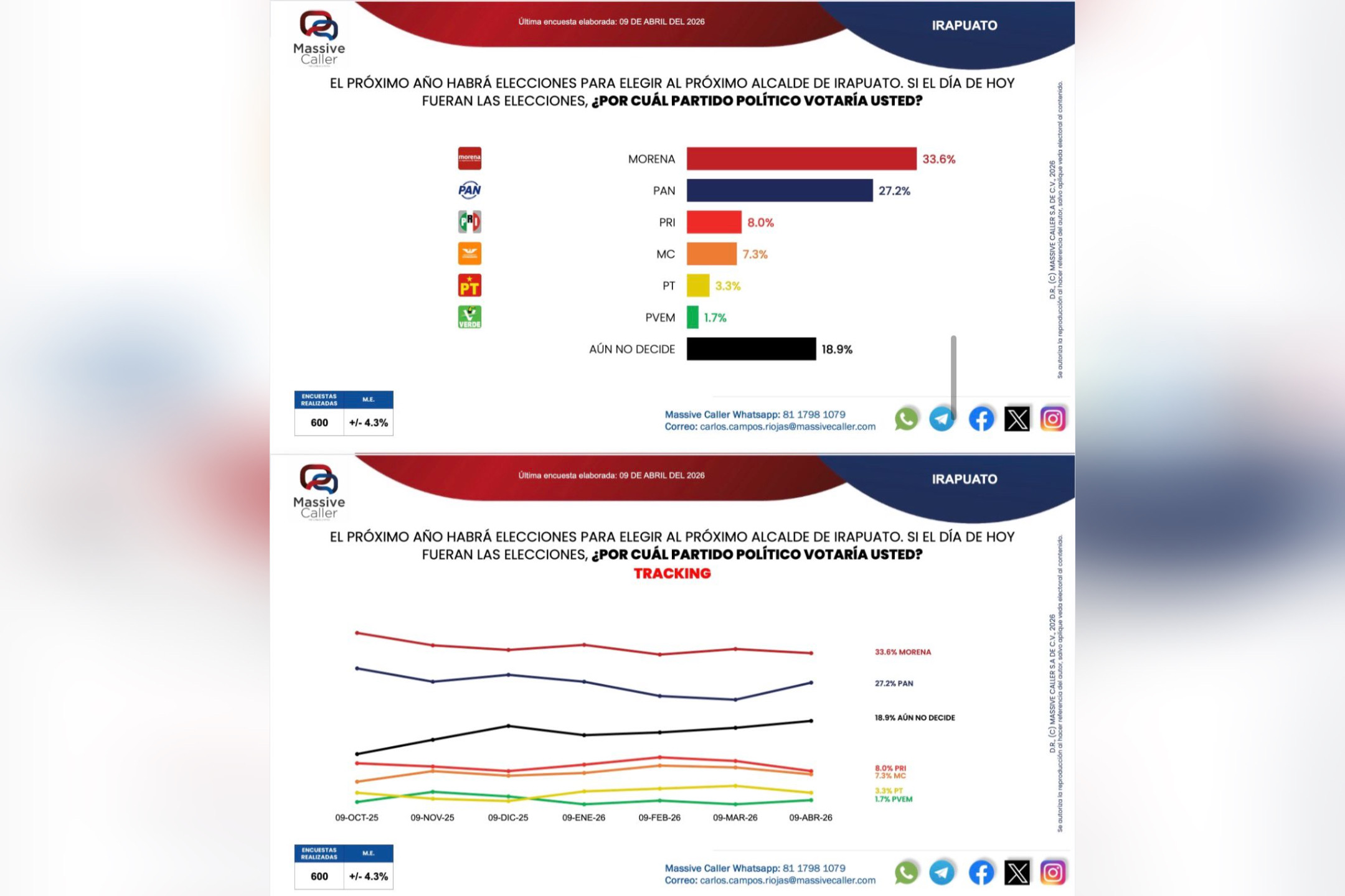 IRAPUATO, GTO.- Una encuesta difundida por la empresa Massive Caller coloca a Morena como la fuerza política con mayor intención de voto en Irapuato rumbo a la elección de alcalde, al alcanzar el 33.6%.