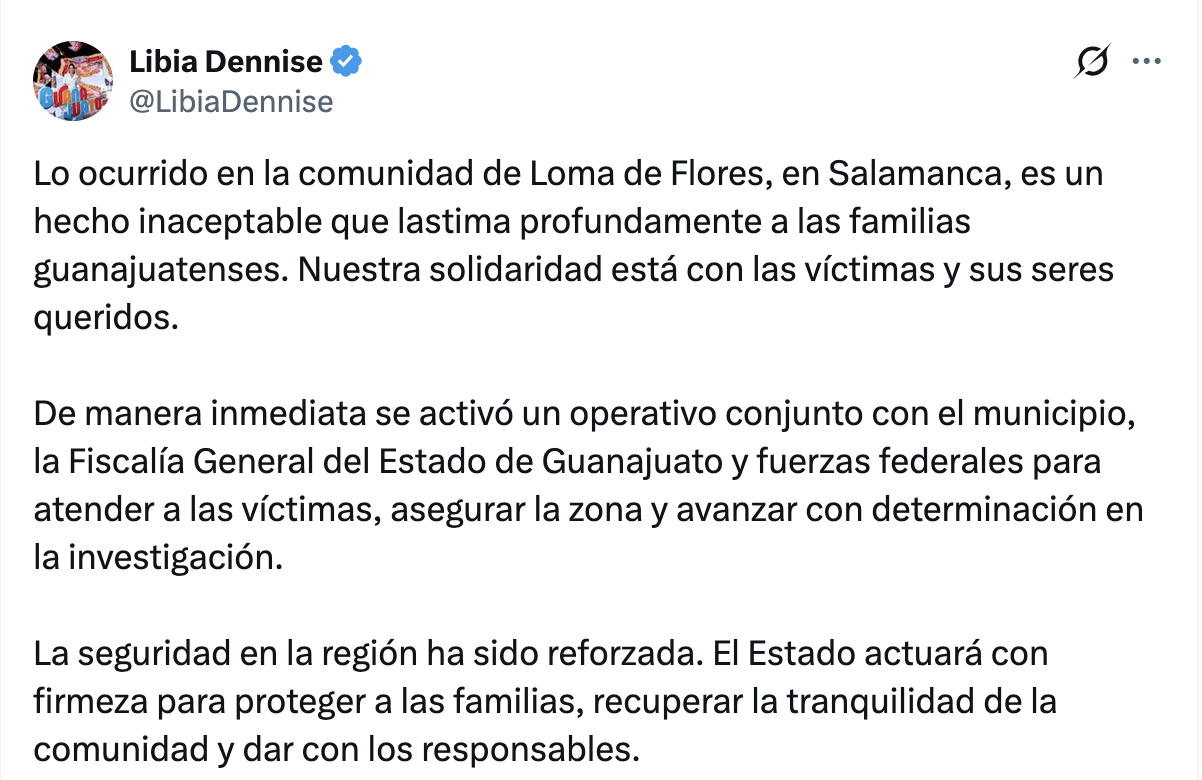 “Lo ocurrido en la comunidad de Loma de Flores, en Salamanca, es un hecho inaceptable que lastima profundamente a las familias guanajuatenses. Nuestra solidaridad está con las víctimas y sus seres queridos.