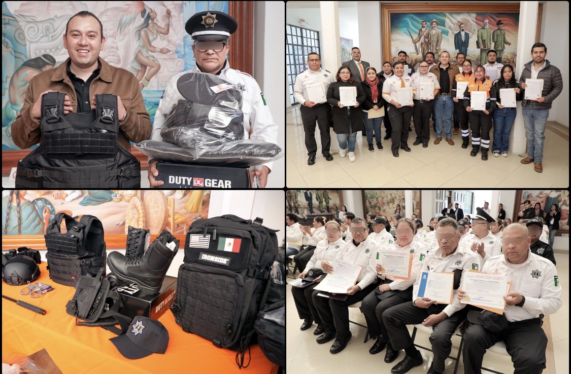 Equipamiento de primer nivel Para reforzar la operatividad y la protección de los elmentos en el cumplimiento de su deber, se hizo entrega de un paquete completo de equipo táctico y uniformes que incluye: