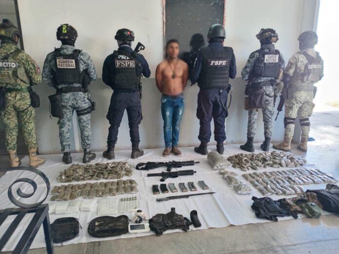 En total, se aseguraron dos armas largas, seis cargadores para armas de alto poder, equipo táctico y ocho mil dosis de droga.