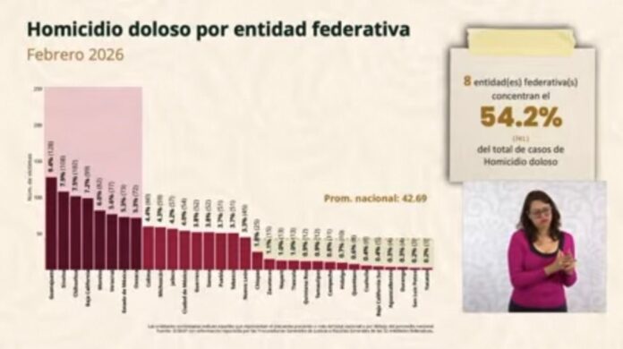 “Asimismo, informamos, la siguiente, por favor, que, al comparar el primer bimestre de 2025, es decir, enero y febrero, contra el primer bimestre de 2026, observamos que 26 entidades federativas disminuyeron su promedio diario de homicidios”.