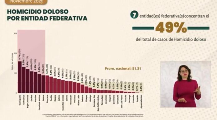 CDMX.-Guanajuato ocupó el primer lugar nacional en homicidio doloso tanto en el periodo acumulado de enero a noviembre 2025 como en el mes de noviembre, de acuerdo con el reporte presentado por la secretaría ejecutiva del Sistema Nacional de Seguridad Pública, Marcela Figueroa Franco, desde la conferencia de prensa mañanera.