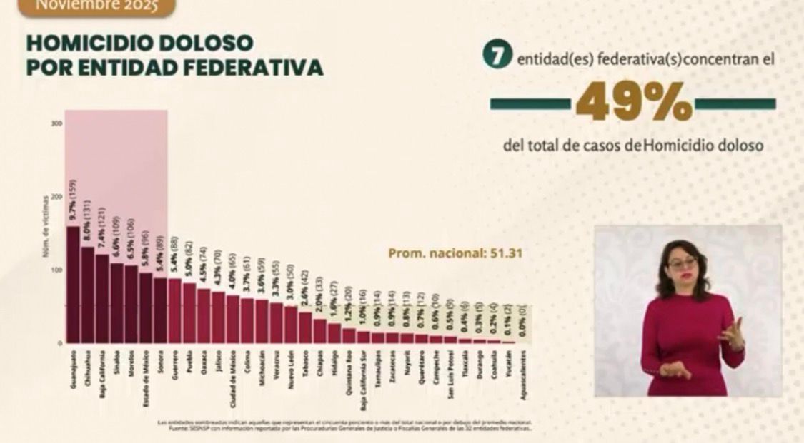 “Está en primer lugar Guanajuato, con 9.7% de los homicidios que se registraron en noviembre, le sigue Chihuahua con 8%, Baja California en tercer lugar con 7.4%, le sigue Sinaloa en cuarto lugar con 6.6%, en quinto lugar, Morelos con 6.5%, Estado de México con 5.8%, y en séptimo lugar Sonora con 5.4%”, acotó.