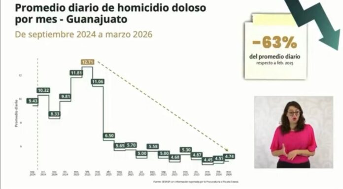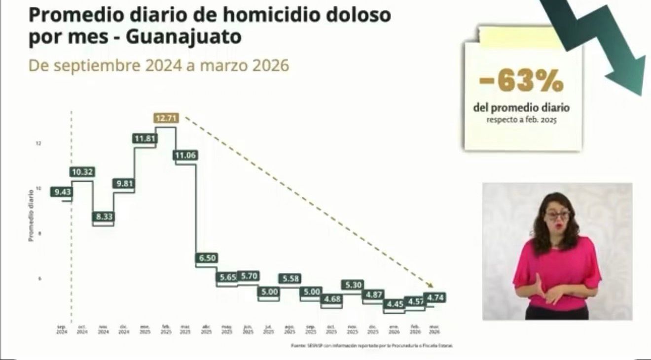 “Después de que Guanajuato llegara a registrar 12.71 homicidios diarios en febrero de 2025, en el mes que acaba de terminar, marzo de 2026, se registraron 4.74 homicidios dolosos en promedio diario, lo que significa una disminución del 63 por ciento en el promedio diario de homicidios dolosos”, dijo.
