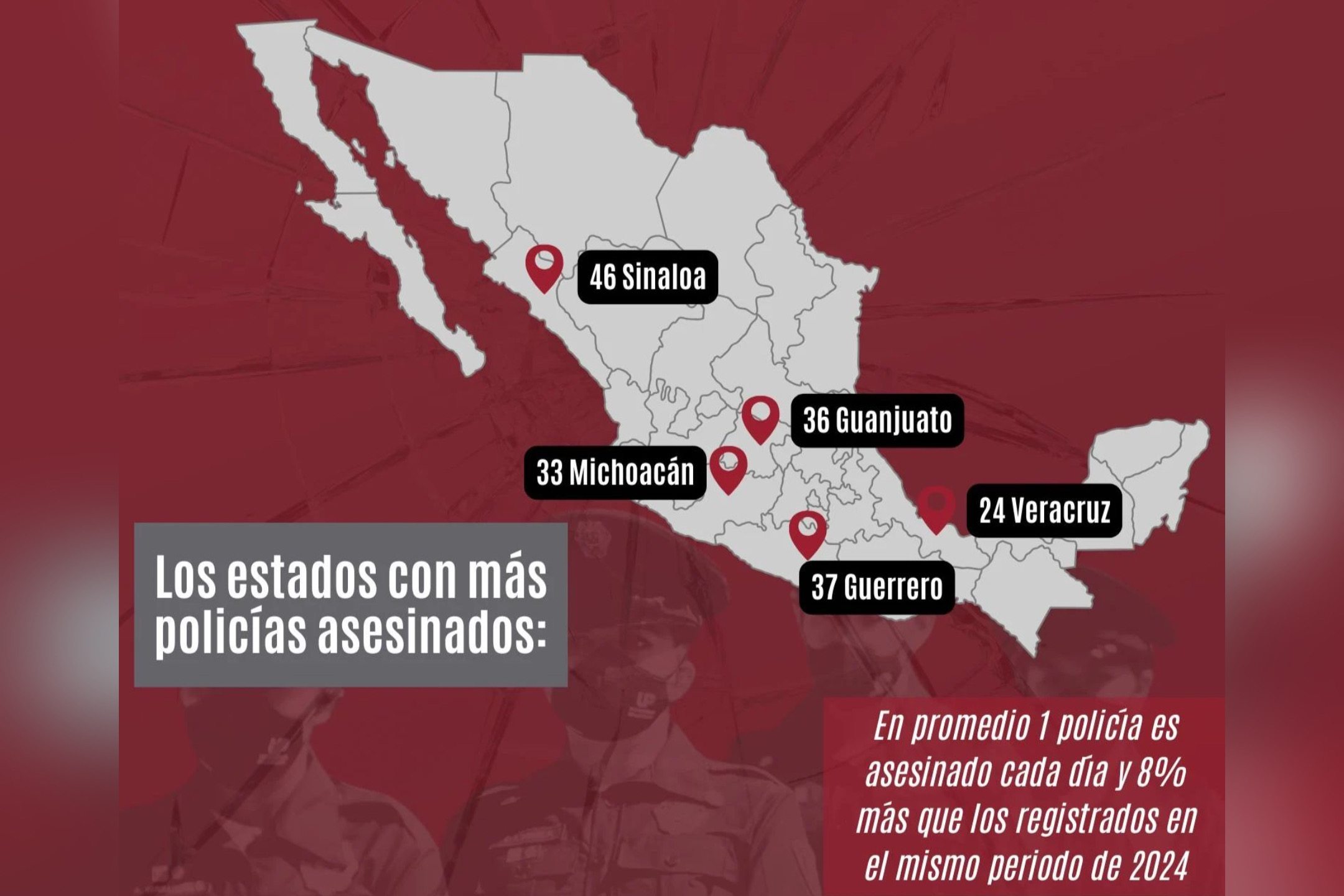 Sinaloa encabeza la lista de estados con más policías asesinados en 2025, con 46 casos, seguido de Guerrero con 37, Guanajuato con 36, Michoacán con 33 y Veracruz con 24.