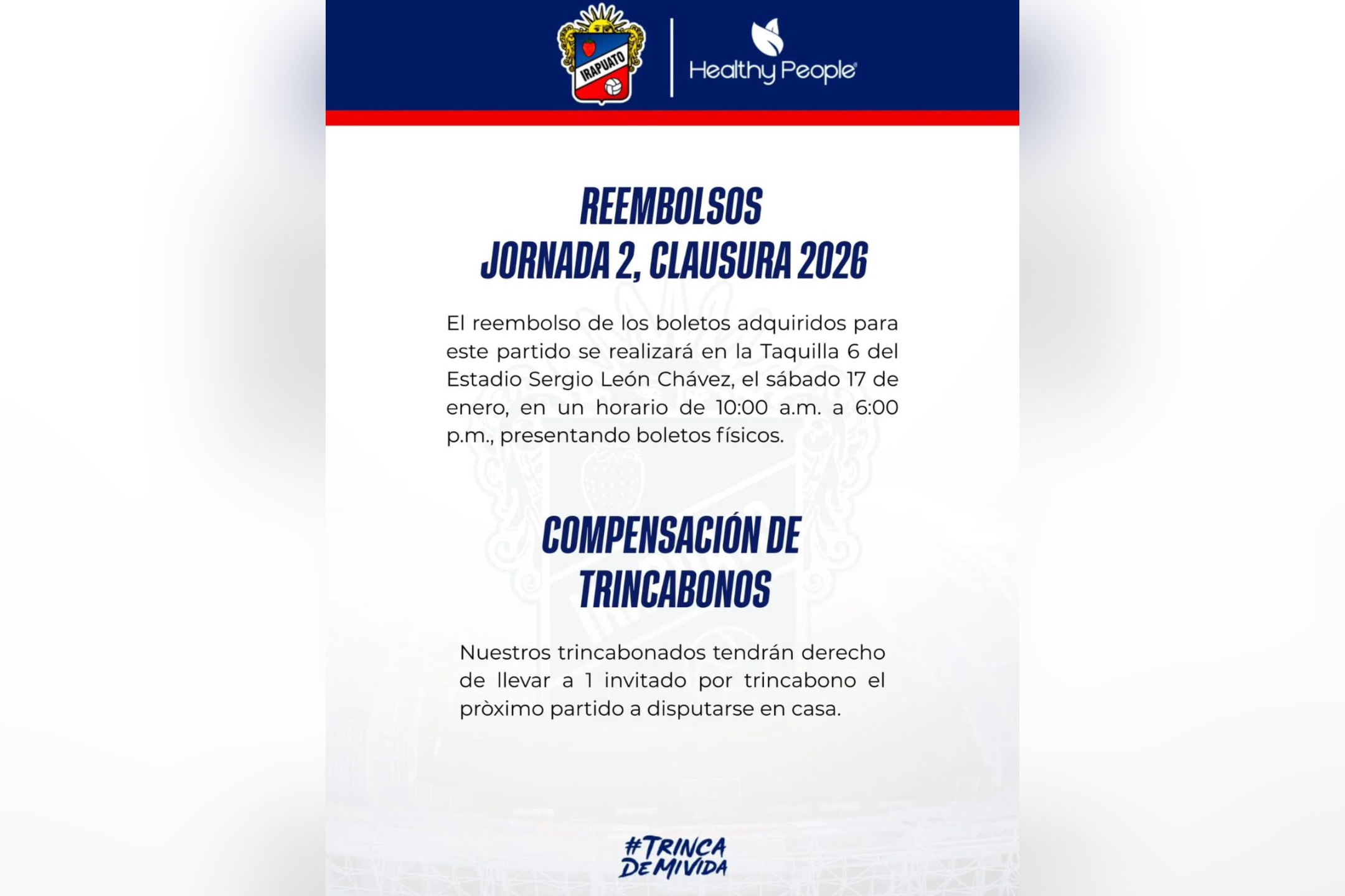 Finalmente, se informó que el reembolso de los boletos adquiridos se realizará en la Taquilla 6 del Estadio Sergio León Chávez, este sábado 17 de enero, en un horario de 10:00 de la mañana a 6:00 de la tarde, presentando los boletos físicos, reiterando el agradecimiento a la afición por su respaldo permanente al proyecto.
