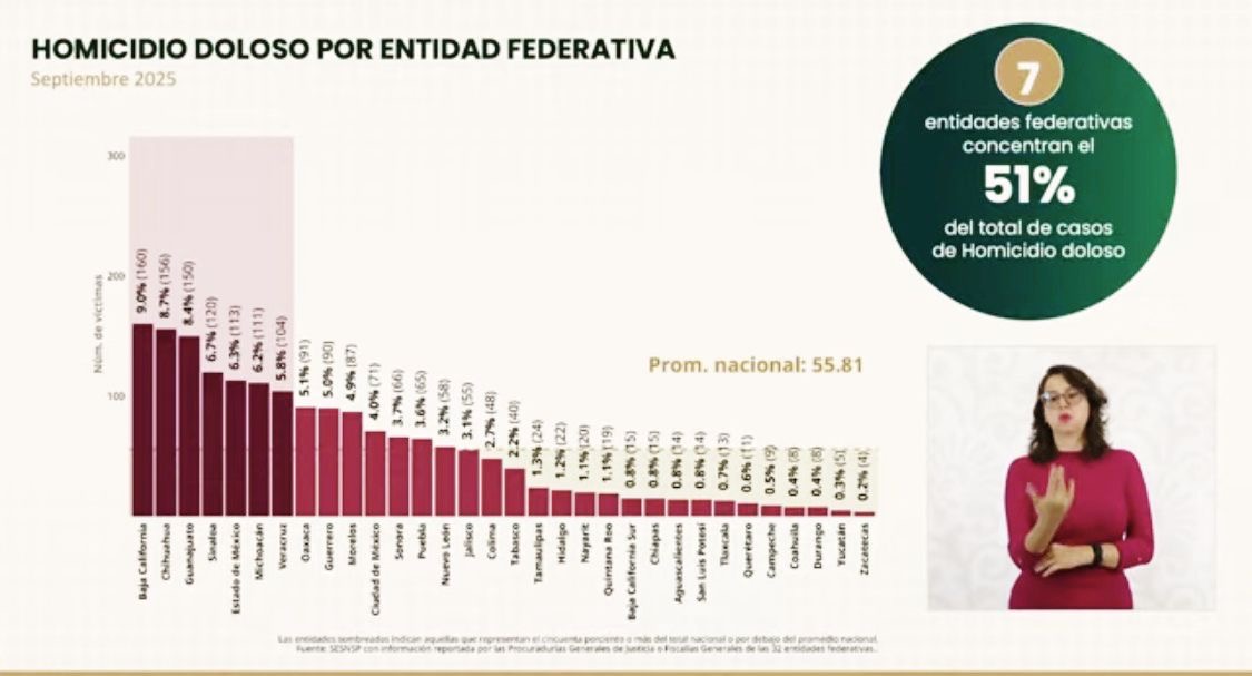 La secretaria señaló que en primer lugar está Guanajuato, que representó el 11.13 por ciento el total de homicidios a nivel nacional de enero a septiembre de este 2025.