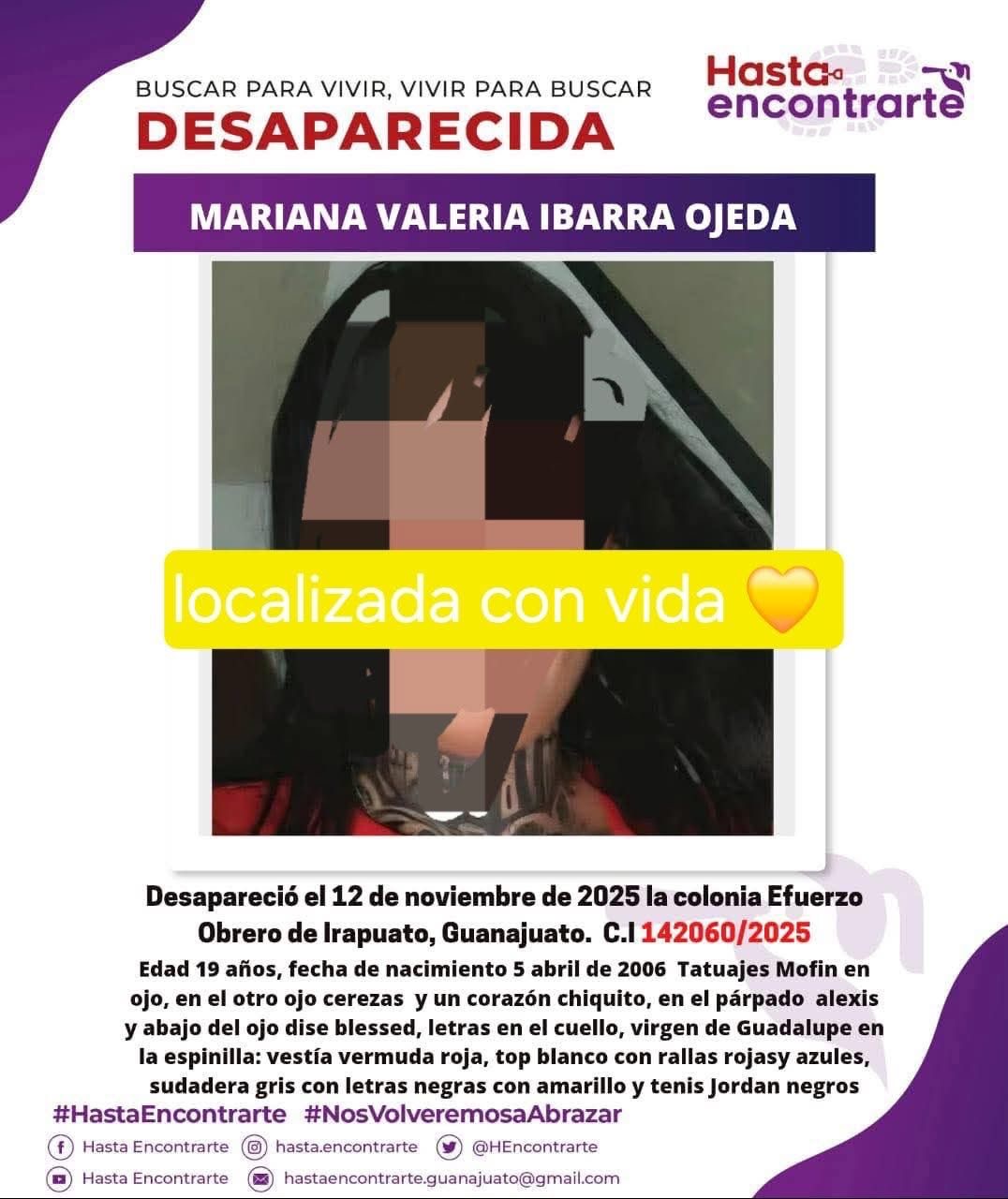 Irapuato.- La madrugada de este viernes se confirmó la localización con vida de Mariana Valeria Ibarra Ojeda, hija de una madre buscadora del colectivo “Hasta Encontrarte”, cuya desaparición había sido reportada el 12 de noviembre en la colonia Esfuerzo Obrero, en Irapuato.