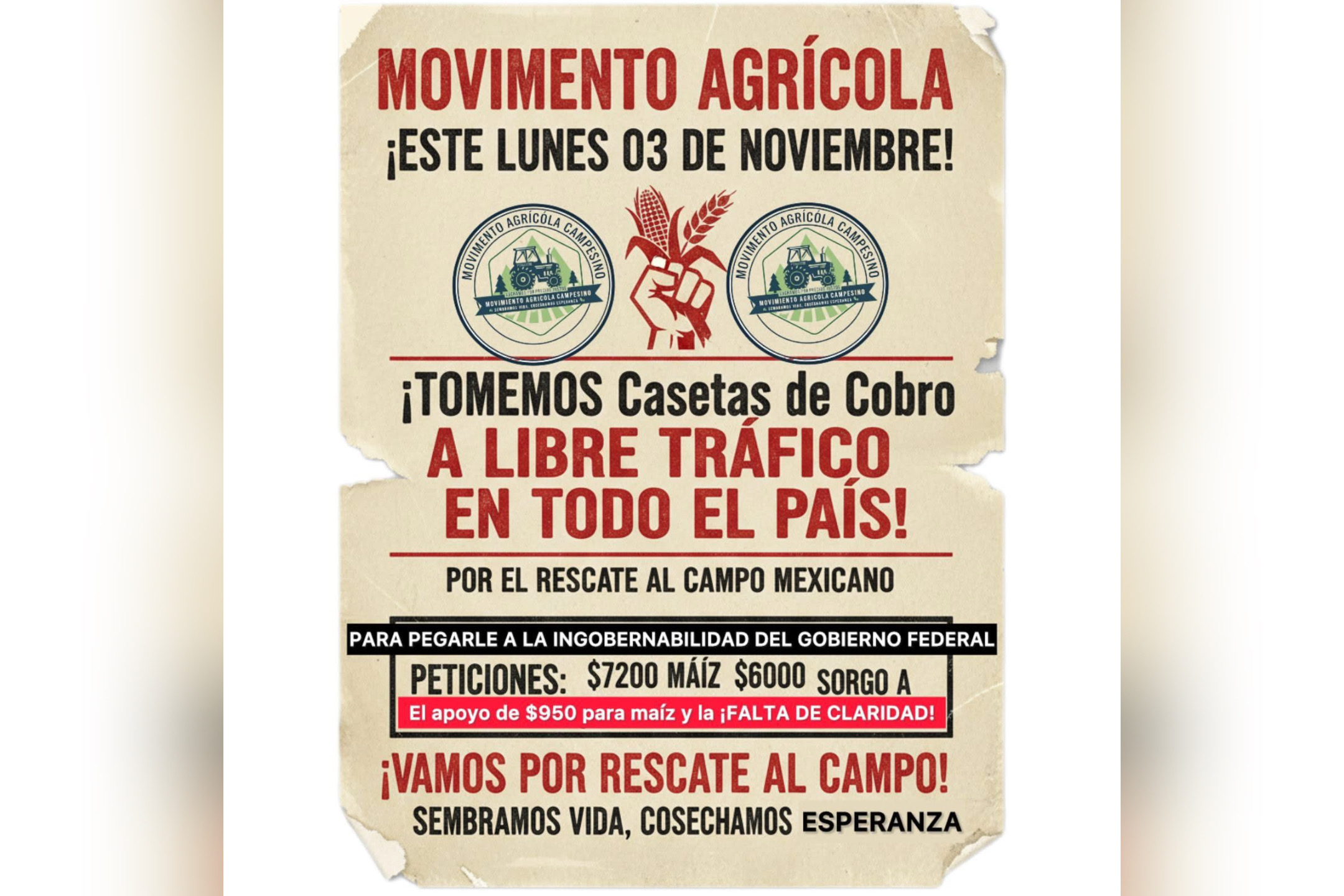 La medida, anunciada como una acción de presión pacífica, responde al desacuerdo con los apoyos económicos establecidos por el gobierno federal, que ascienden a 950 pesos por tonelada de grano, cifra considerada insuficiente por los productores.