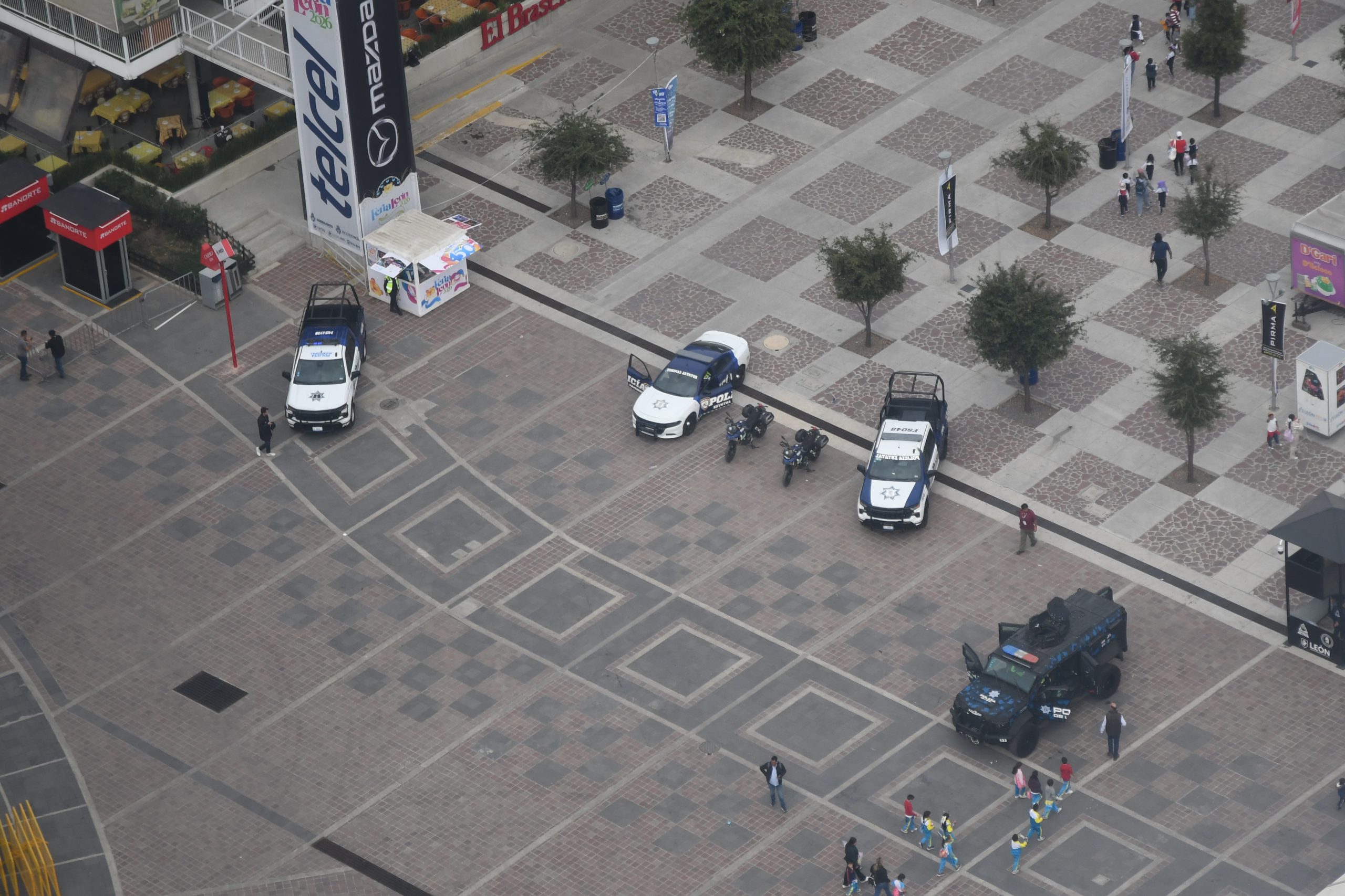 Al ingreso de la Feria Estatal de León, dentro del Distrito León Mx, se encuentran unas patrullas de la Policía Estatal de Caminos, la Policía Rural y las FSPE, las cuales mantienen presencia en las instalaciones para que las y los ciudadanos pueden saludarlos, subirse a las unidades y platicar con ellos.