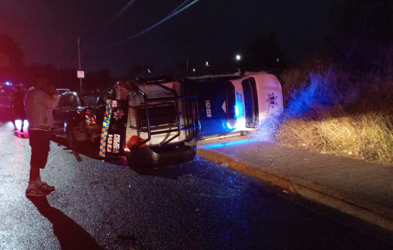 Para prevenir riesgos, otro vehículo y posteriormente una patrulla municipal se colocaron para abanderar la zona, sin embargo, se registró el impacto que derivó en la volcadura de la unidad policial y daños en otras unidades, incluido un camión de transporte de personal.