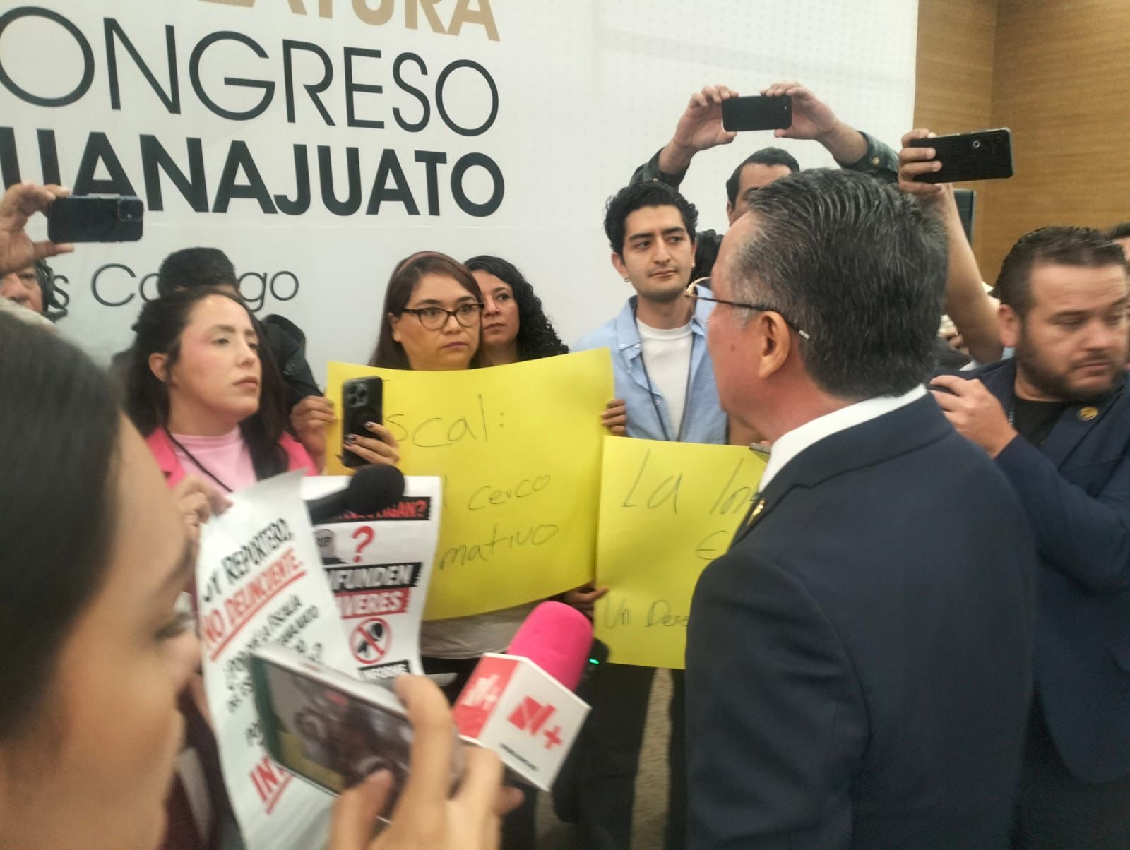 La protesta ocurrió en las instalaciones del Congreso del Estado de Guanajuato, donde el fiscal acudió a comparecer ante diputados como parte del análisis de su segundo informe de actividades.