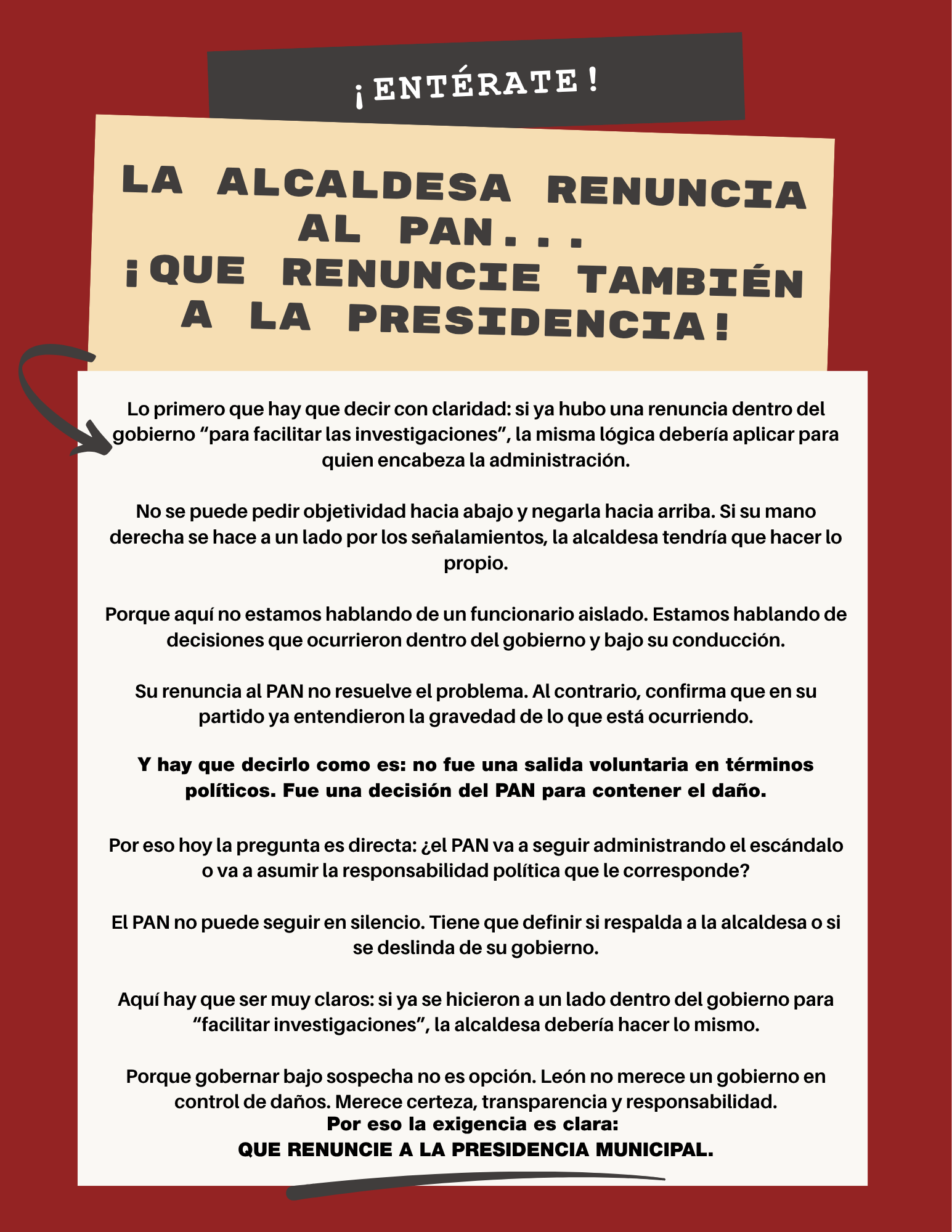 Por medio de su cuenta de “x” compartió un documento donde detalla las razones por las que piden que Alejandra Gutiérrez se separe del cargo: “Desde #Morena, queremos dejar claro nuestro posicionamiento ante la renuncia de la alcaldesa de #León, Alejandra Gutiérrez, a su partido. No se trata solo de dejar un partido; es indispensable que renuncie también a la presidencia. Si su intención es no entorpecer las investigaciones, entonces que lo haga de manera formal, dejando el cargo. Su liderazgo no se ha visto comprometido por rumores ni “ataques”, sino por las decisiones de su propio gobierno, acciones que la han llevado a esta situación y que ella ha tolerado por mucho tiempo junto a sus aliados. ¡𝐑𝐞𝐧𝐮𝐧𝐜𝐢𝐚𝐫 𝐚𝐥 𝐩𝐚𝐫𝐭𝐢𝐝𝐨 𝐧𝐨 𝐞𝐬 𝐬𝐮𝐟𝐢𝐜𝐢𝐞𝐧𝐭𝐞; 𝐝𝐞𝐛𝐞 𝐫𝐞𝐧𝐮𝐧𝐜𝐢𝐚𝐫 𝐚𝐥 𝐩𝐮𝐞𝐬𝐭𝐨!”
