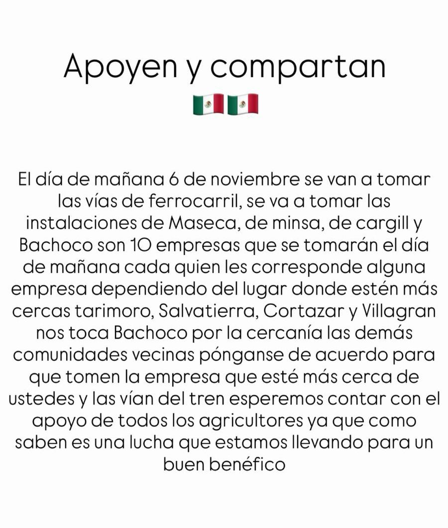 Se prevé la toma de las vías del ferrocarril, así como de instalaciones de compañías como Maseca, Minsa, Cargill y Bachoco, en distintos municipios del estado.