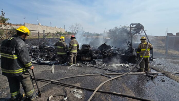 De acuerdo con los primeros reportes, el siniestro se originó en un pastizal cercano y se propagó hasta alcanzar la unidad, que terminó envuelta en llamas.