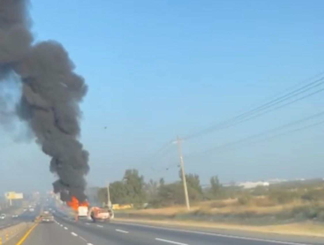 Imágenes difundidas en redes sociales muestran al vehículo detenido sobre el acotamiento mientras las llamas lo consumen por completo.