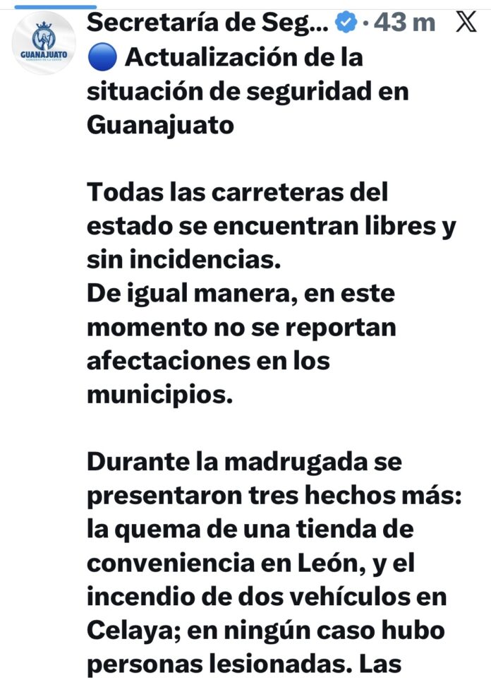 Guanajuato.-La Secretaría de Seguridad y Paz del Estado de Guanajuato confirmó que la situación de seguridad se mantiene controlada y sin afectaciones en los municipios, por lo que todas las carreteras estatales y federales permanecen abiertas y sin incidentes.