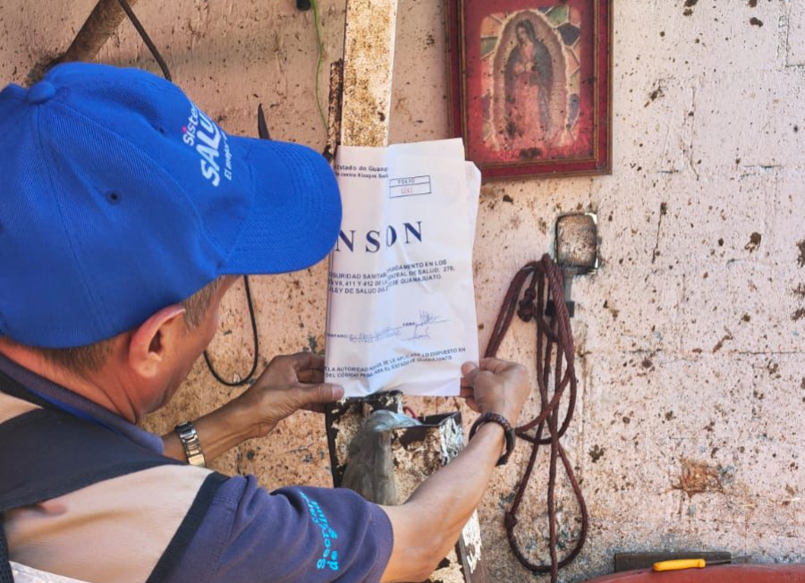 PÉNJAMO, GTO.- La Secretaría de Salud de Guanajuato, a través de la Dirección General de Protección contra Riesgos Sanitarios (DGPRIS), informa que se aplicó la suspensión total temporal de trabajos y servicios a un matadero particular ubicado en la colonia San Miguel, en el municipio de Pénjamo.