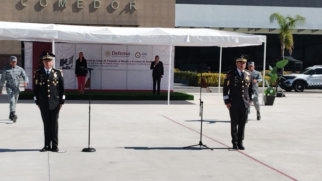 Irapuato.- En una ceremonia cívico-militar celebrada en las instalaciones de la 12 Región Militar en Irapuato, se llevó a cabo la toma de posesión de mando y protesta de bandera de Alfredo Salgado Vargas como comandante interino de la tercera coordinación regional de la Guardia Nacional.